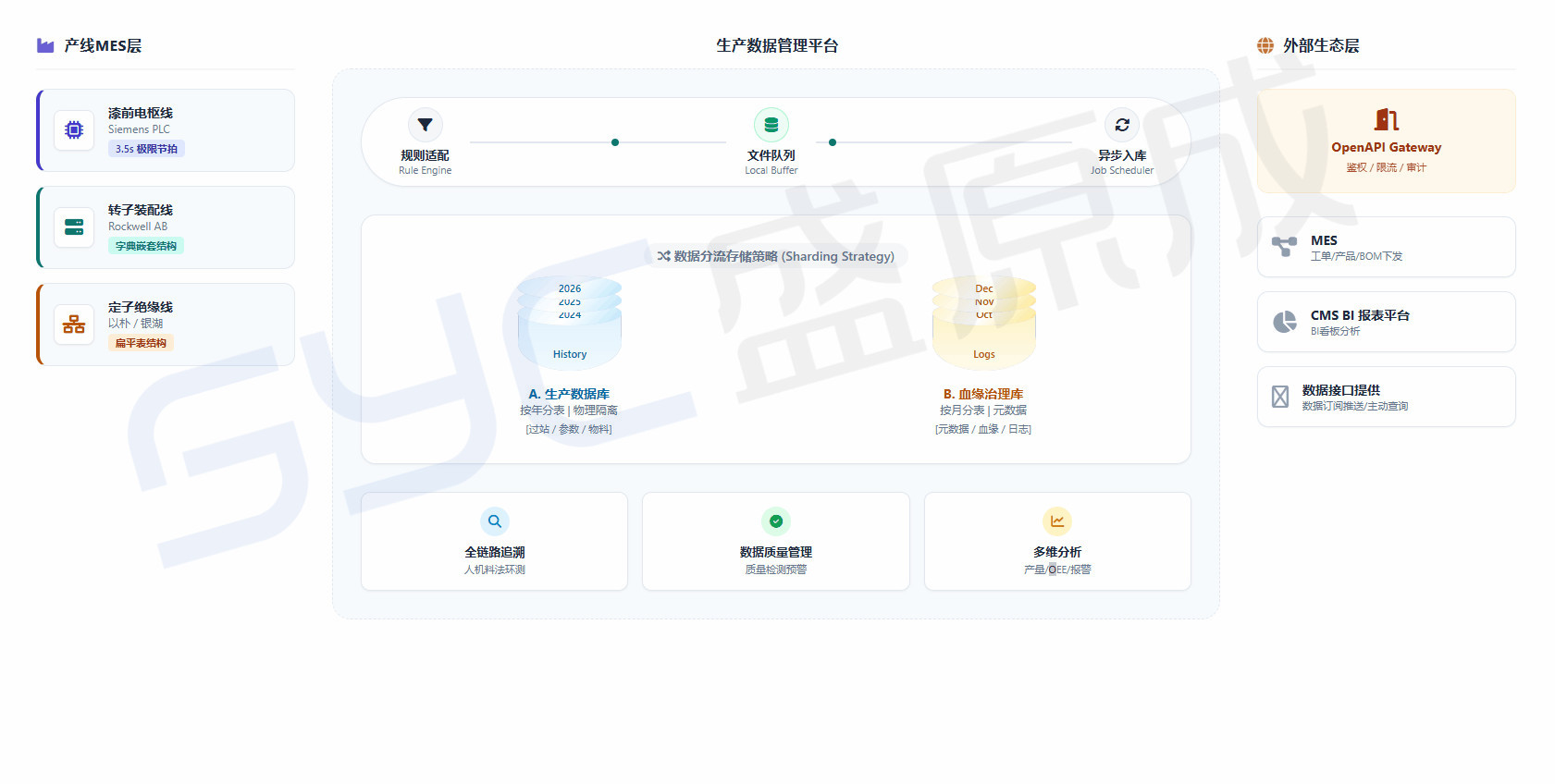 • 目标: 打造工厂级统一数据中枢,打破异构系统壁垒,满足100%全生命周期追溯要求,并沉淀数据资产。