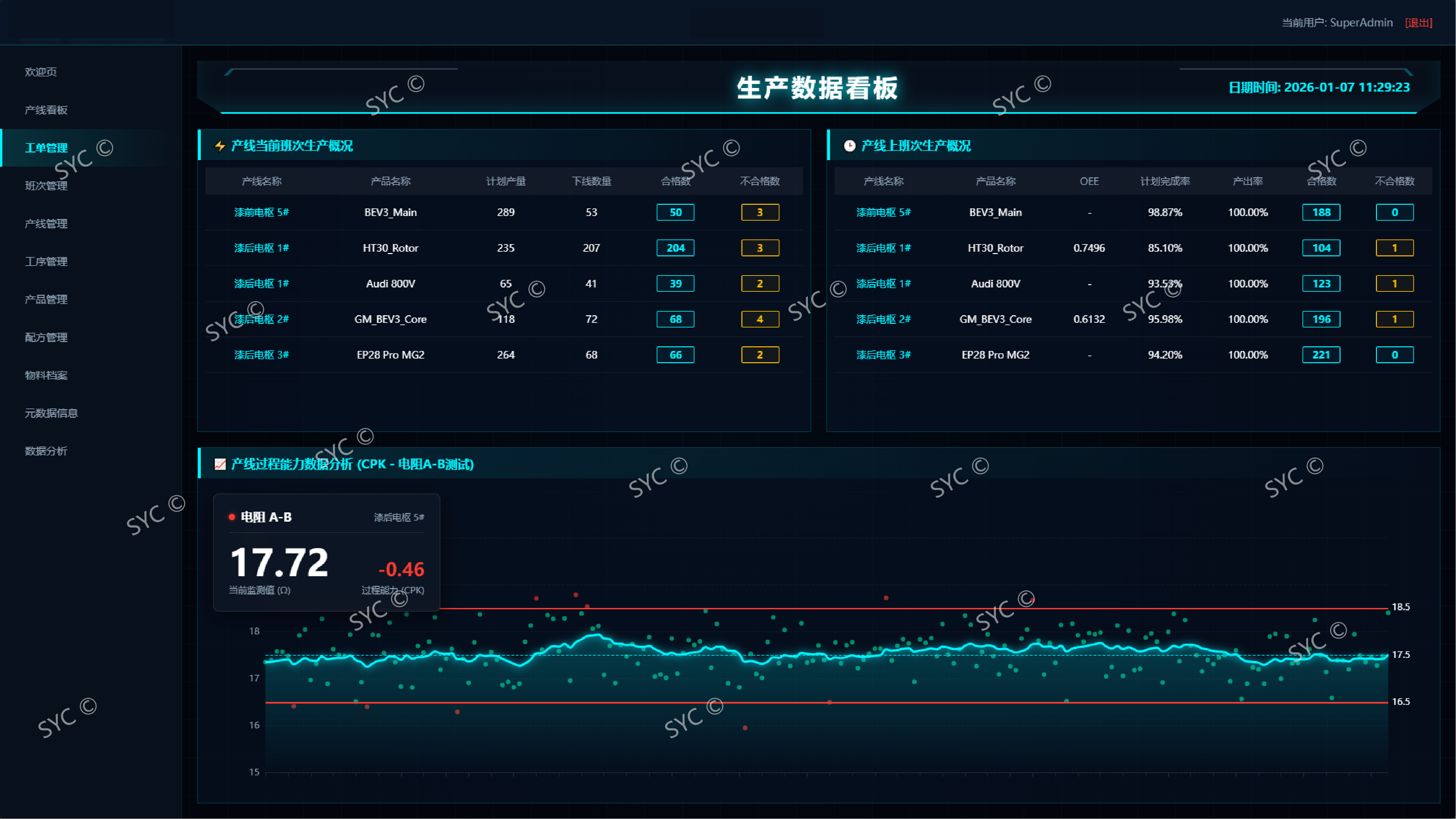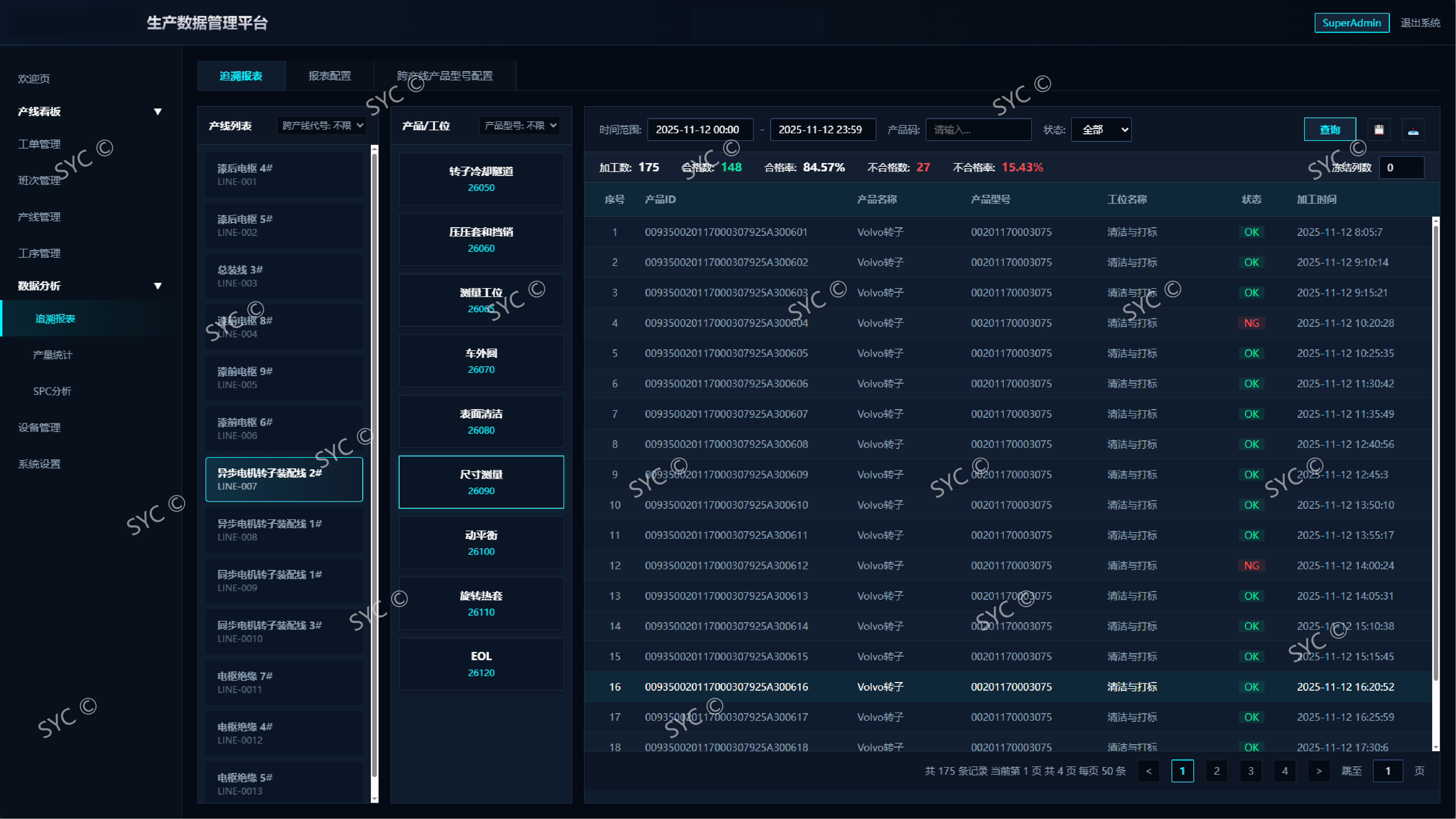 跨产线全生命周期追溯:基于统一的数据模型,实现产品在“转子线->电枢线->总成线”等复杂物理路径间的完整履历串联。一键查询即可获取跨产线的“人、机、料、法、环、测”全维度档案,满足主机厂最高级别的质量审计要求。