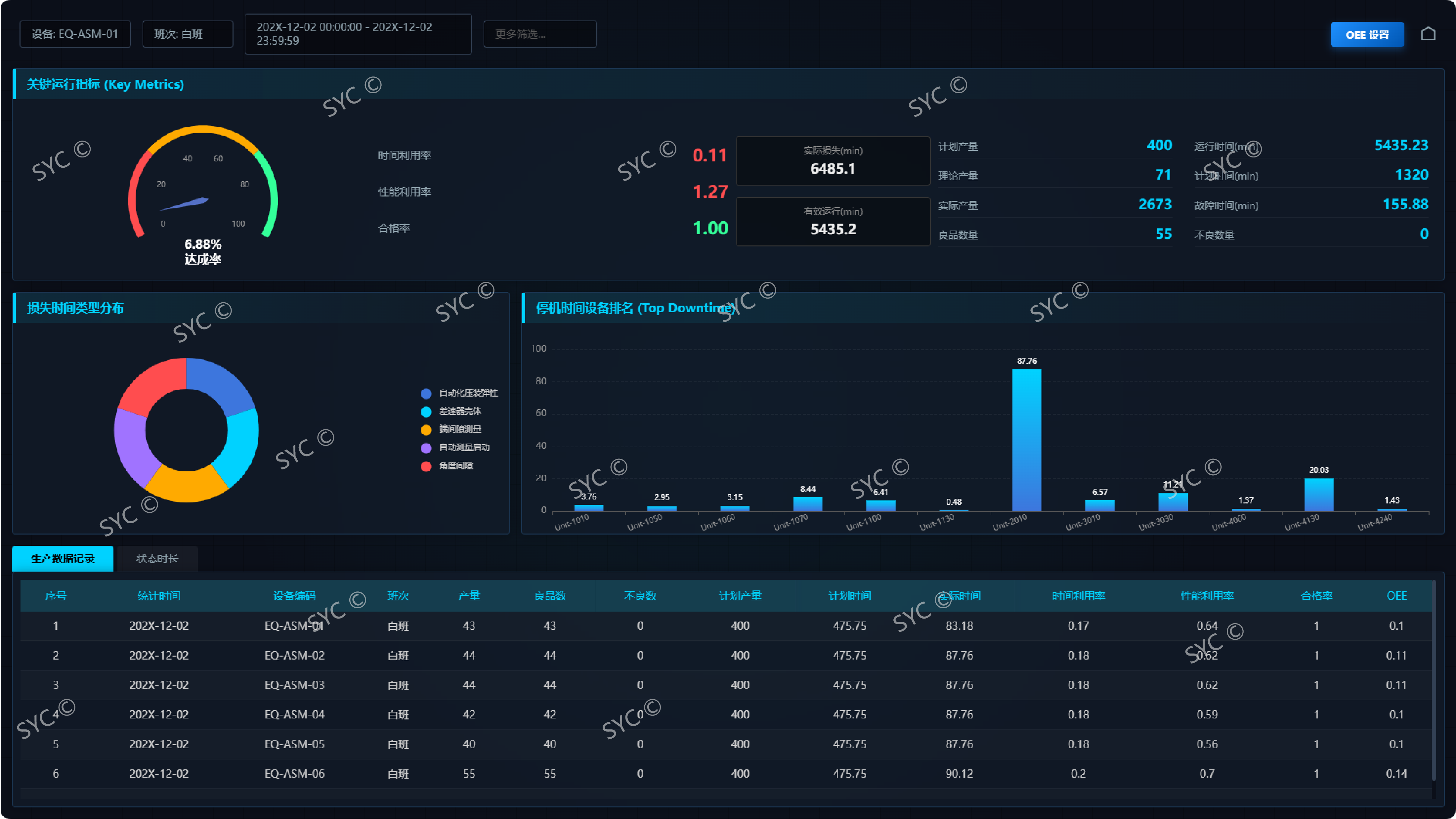 效能分析:数据驱动的效能洞察:系统自动采集设备运行状态、停机时间及产量数据,实时计算产线的设备综合效率。通过可视化的效能分析模板,管理者可以从时间稼动率、性能稼动率和良品率三个维度,精准识别产线瓶颈与效率损失点,为持续的工艺优化与产能提升提供量化依据