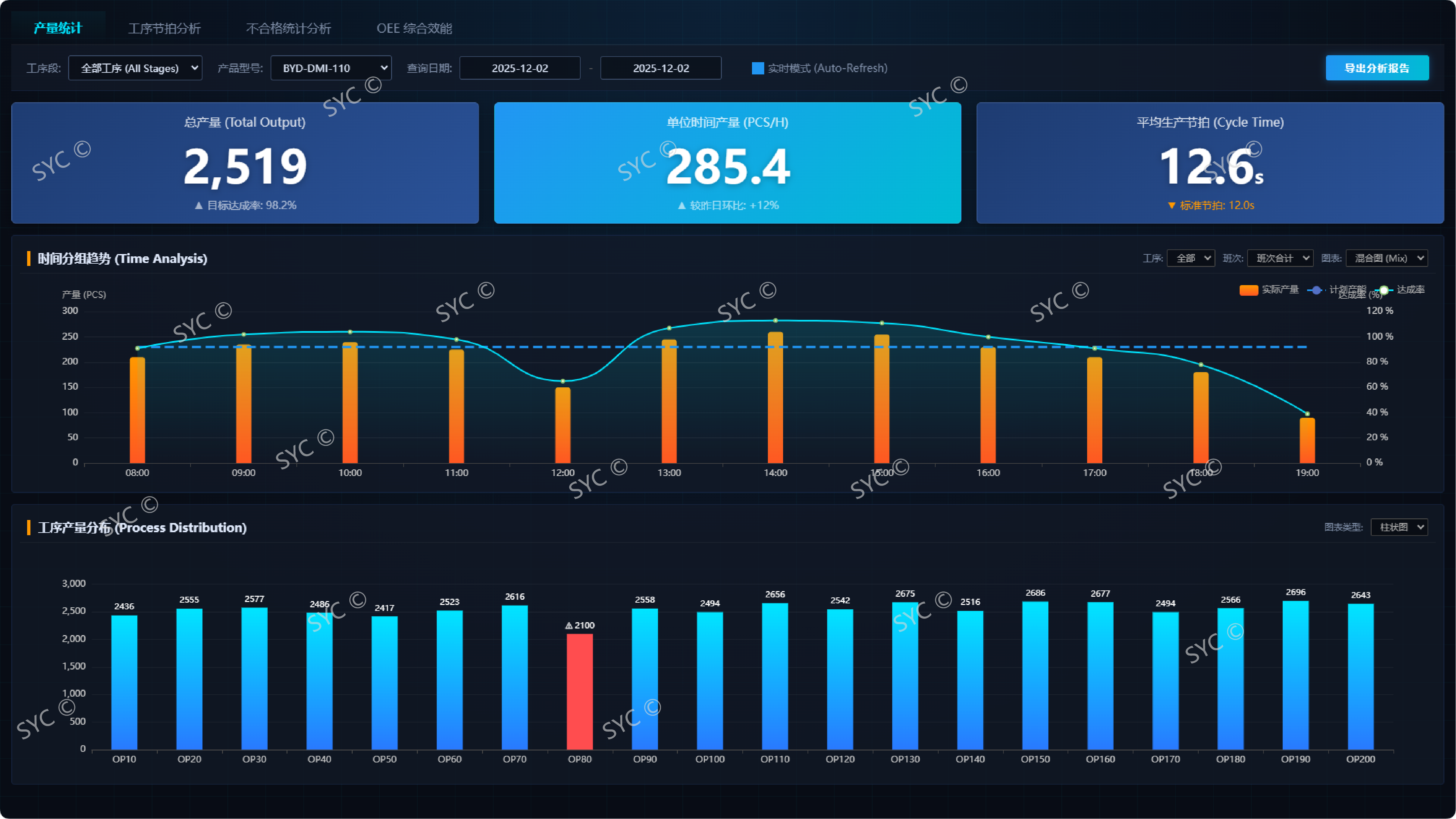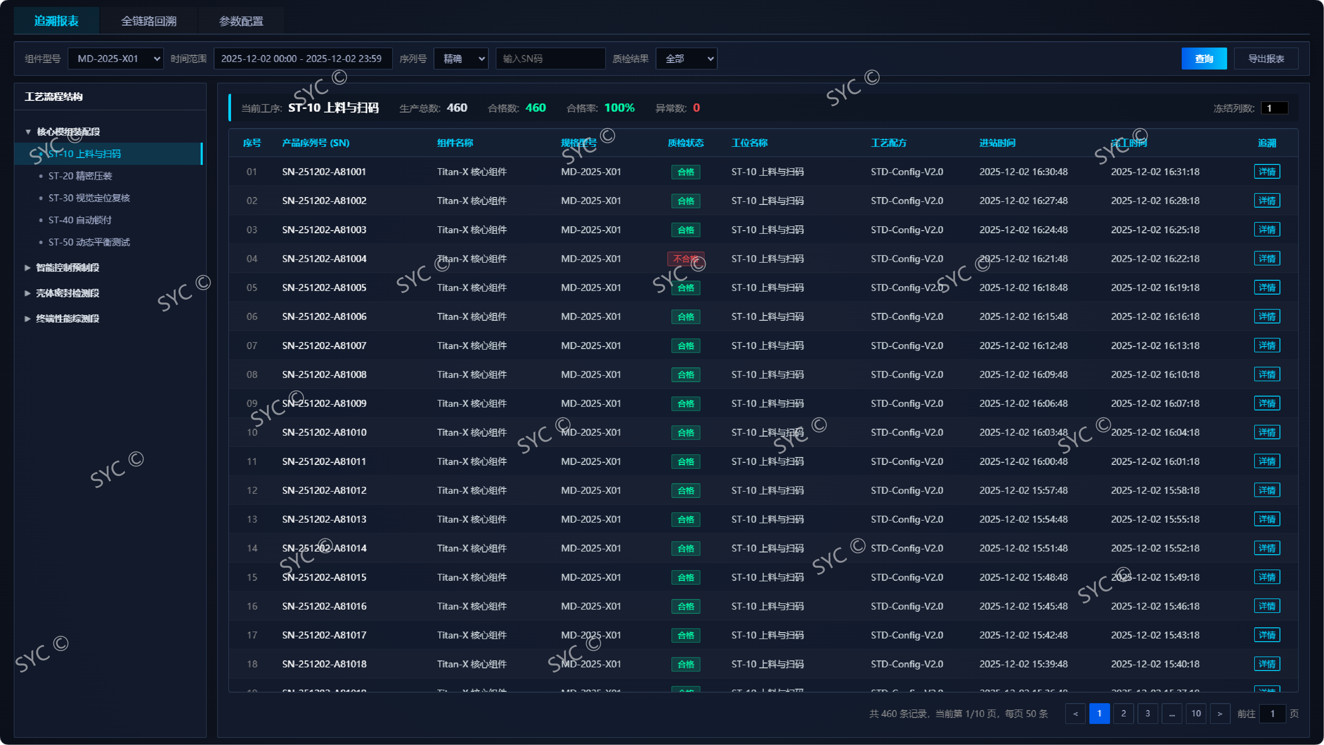 追溯报表:基于海量数据的高效存储能力,系统建立了以“产品唯一码”为索引的全链路追溯档案。无论是关键工艺参数、使用的物料批次,还是过站时间与操作人员,用户均可通过扫描或输入条码,在秒级时间内调取该产品全生命周期的完整履历,满足主机厂对质量追溯的严苛要求