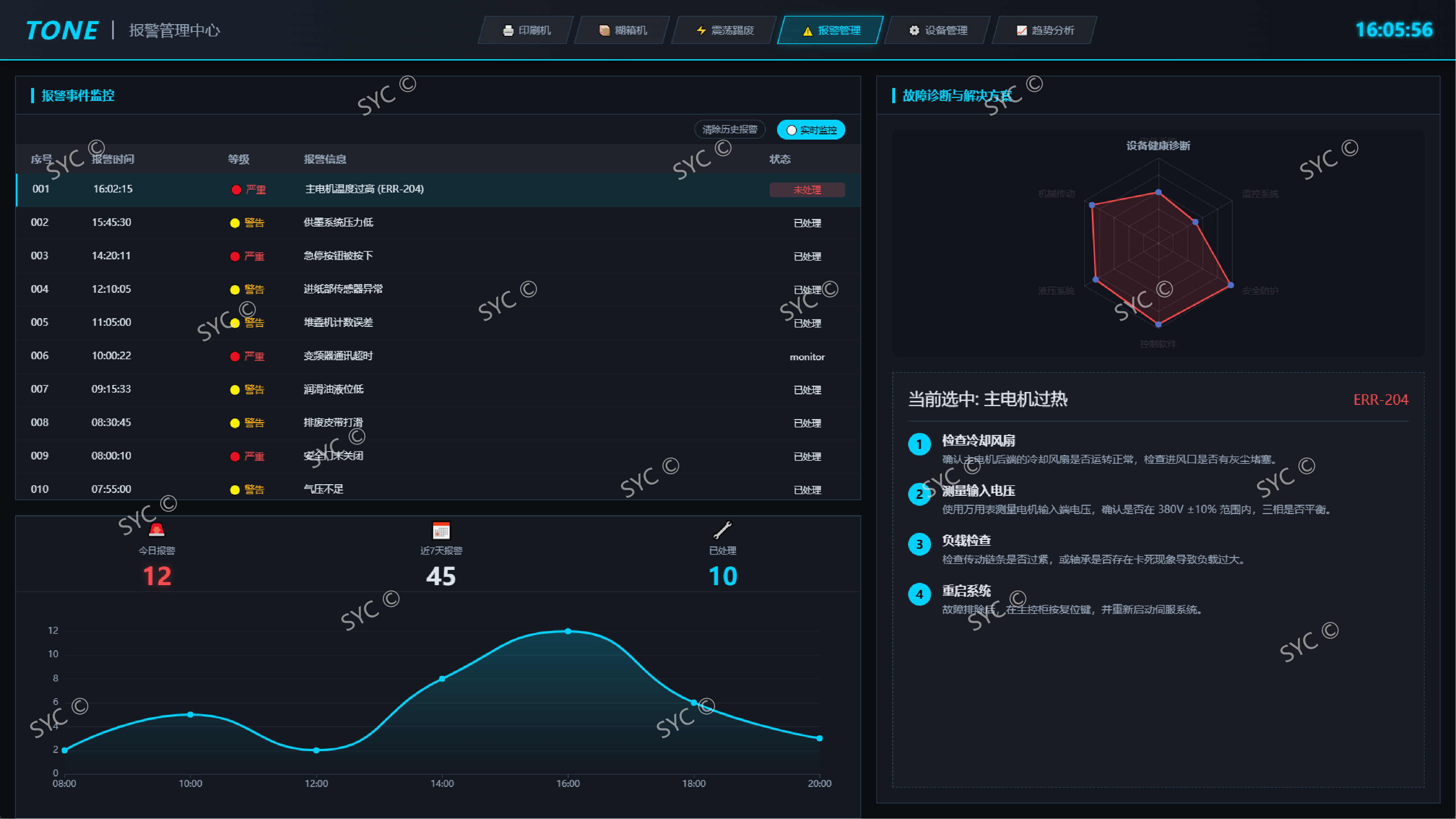 闭环报警管理与维修知识库:将离散的报警代码与结构化的维修解决方案(PDF手册指定页码、历史处理记录)智能关联。当故障发生时,操作人员可在报警界面直接获取处理指南,大幅缩短故障定位与修复时间,并将个人维修经验沉淀为企业知识资产。