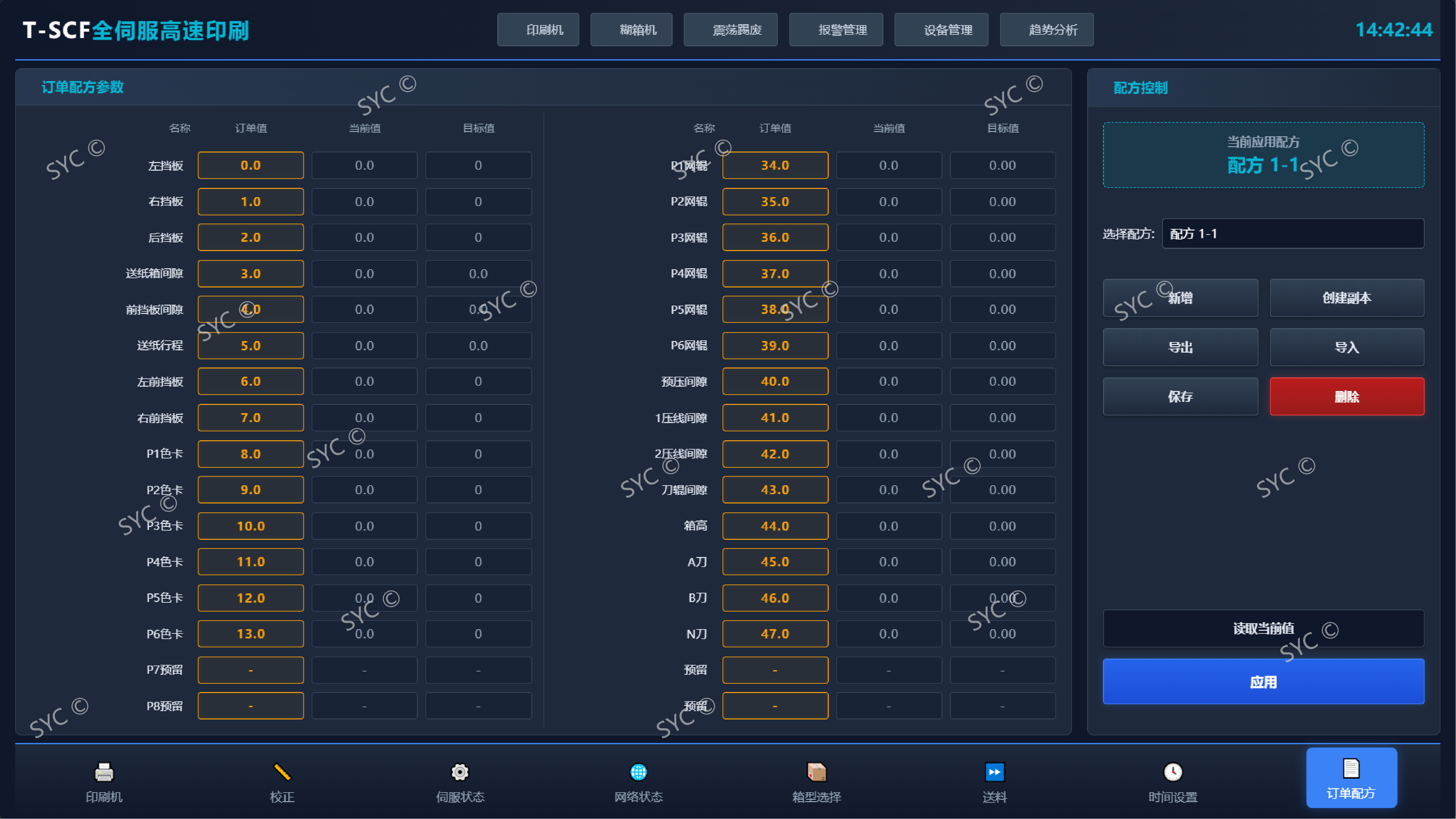 智能工单管理与一键换单:构建数字化配方管理中心,集中管理左/右挡板、网辊压力等数百项工艺参数。支持Excel导入与一键下发,将原本依赖老师傅手动调整、耗时易错的换单流程,转变为精准、快速的自动执行,换单效率提升超过50%。