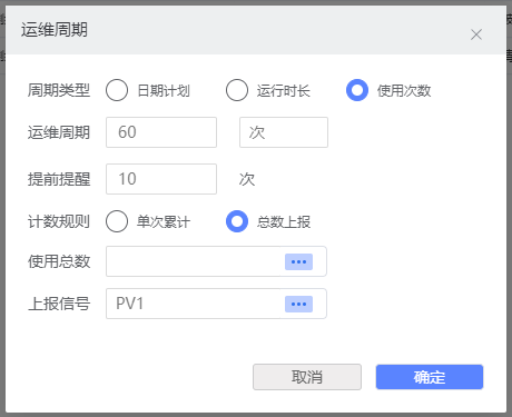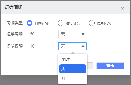• 运维周期:指运维计划执行的时间间隔或频率,通过设置运维周期,每个周期生成一次工单,并根据设定的提前提醒,自动计算达到时触发提醒。