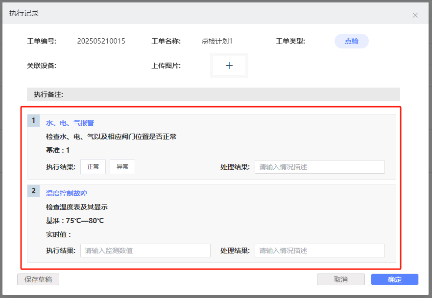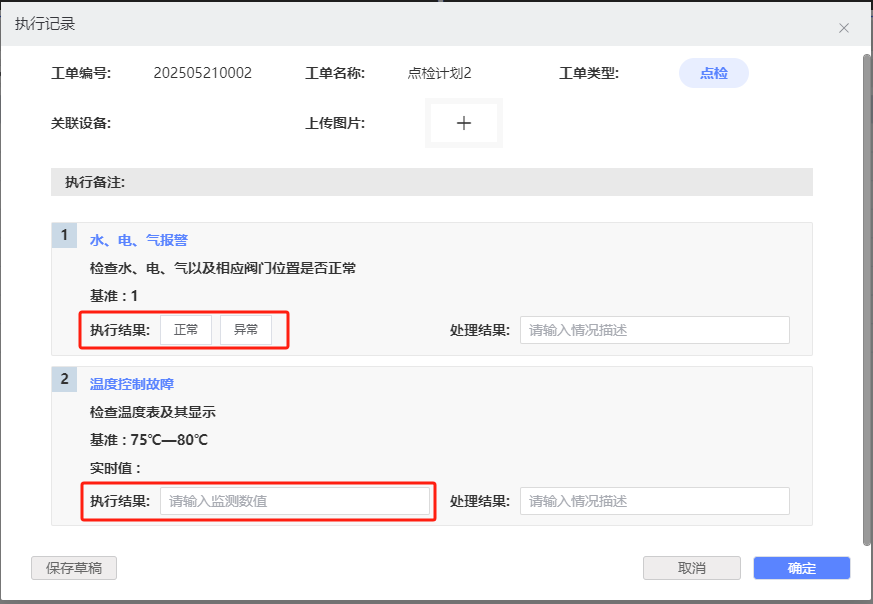 • 数值:运维工单提交执行记录时,输入该项内容的实际监测值作为。