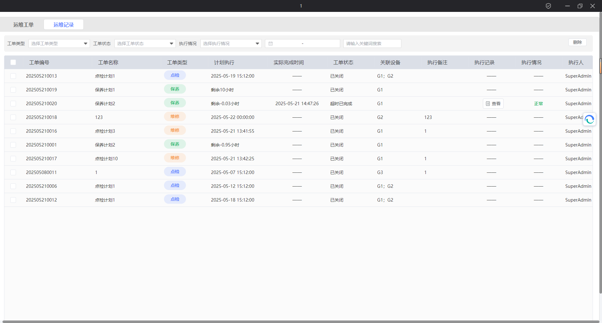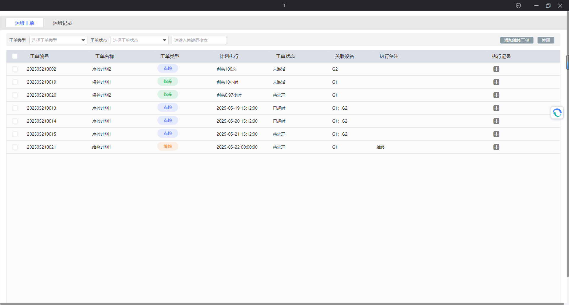 • 设备工单:提供运维工单与运维记录界面,用于跟踪工单状态、添加执行记录,并完成工单后生成运维记录。