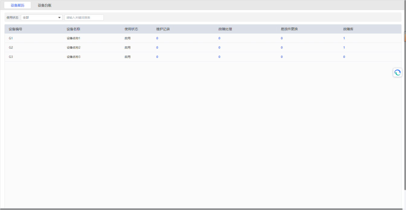 映射设备台账信息并记录设备的全生命周期,根据设备与所有的维护事件以及积累的故障库的关联关系进行映射,用于查看每台设备的历史记录,记录设备的全生命周末并呈现设备从启用以来的所有维护事件以及积累的故障库。