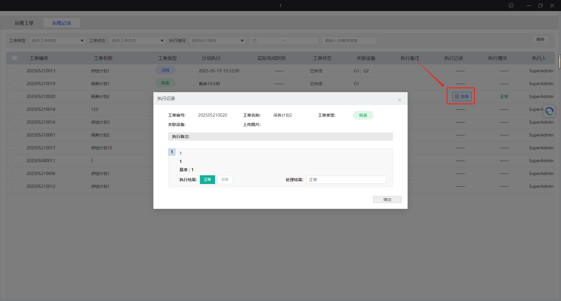 • 维护记录:指该设备已执行运维工单的数量,点击数字弹窗查看该设备的运维记录列表。