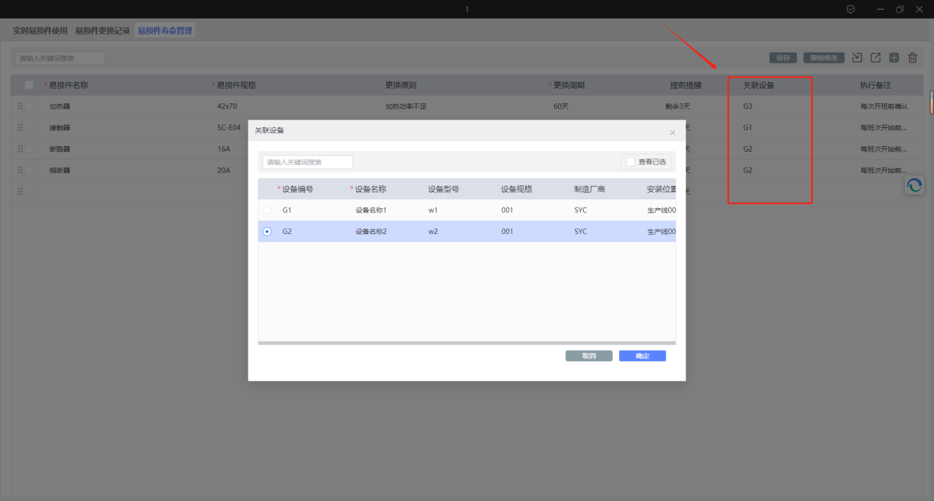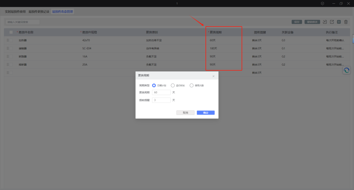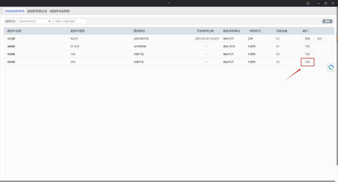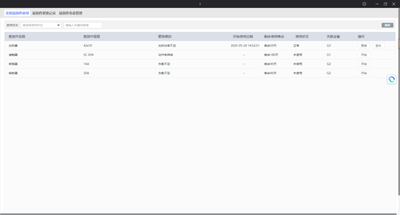 • 易损件管理:提供易损件寿命管理、实时易损件使用与易损件更换记录界面,支持现场统一管理易损件的更换周期,跟踪关键易损部件的使用状况,同时生成易损件更换记录。