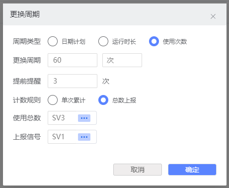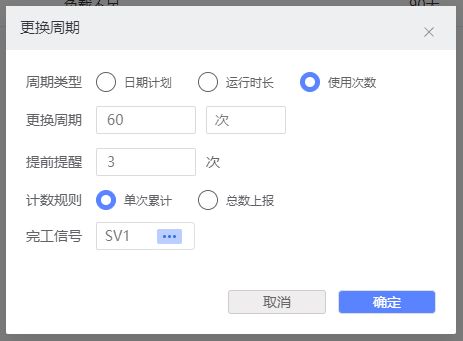 • 更换通知信号:对易损件使用进行动作的检测信号,包括更换和延长操作,关联二进制变量,当易损件完成更换或延长动作时,触发信号从0->1,完成后,手动/自动复位1->0。