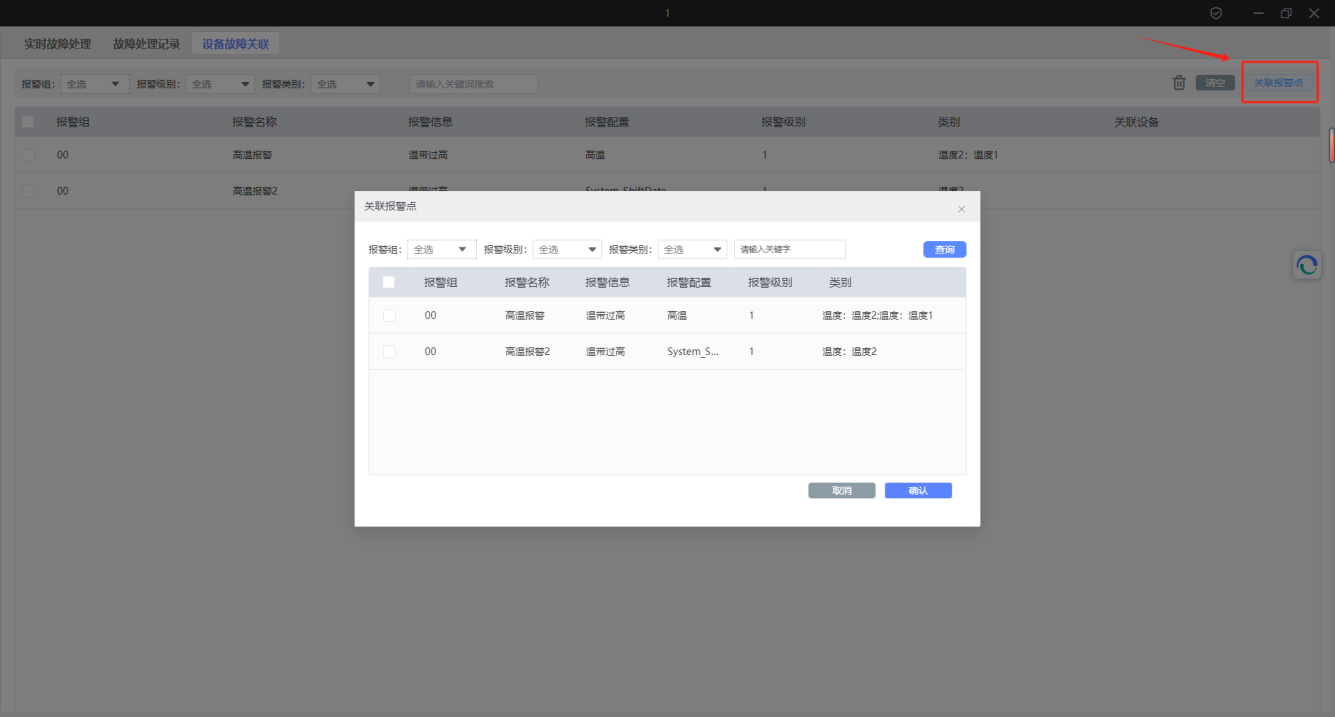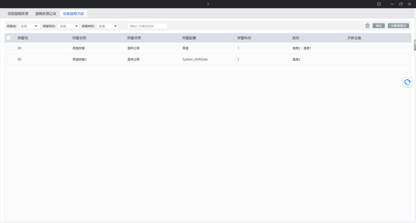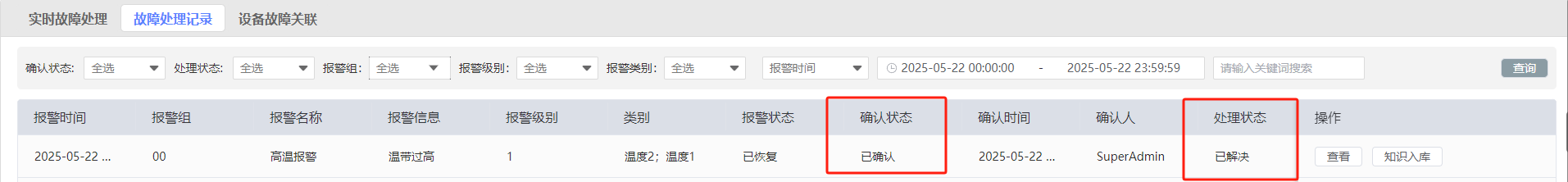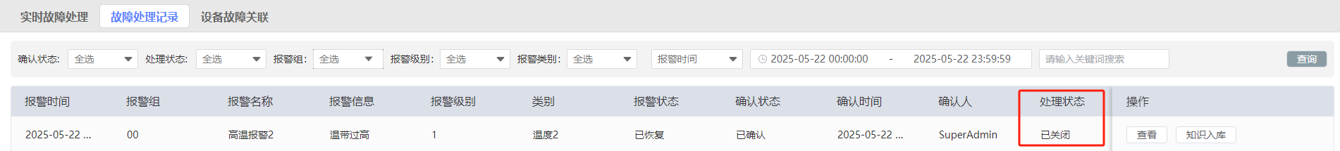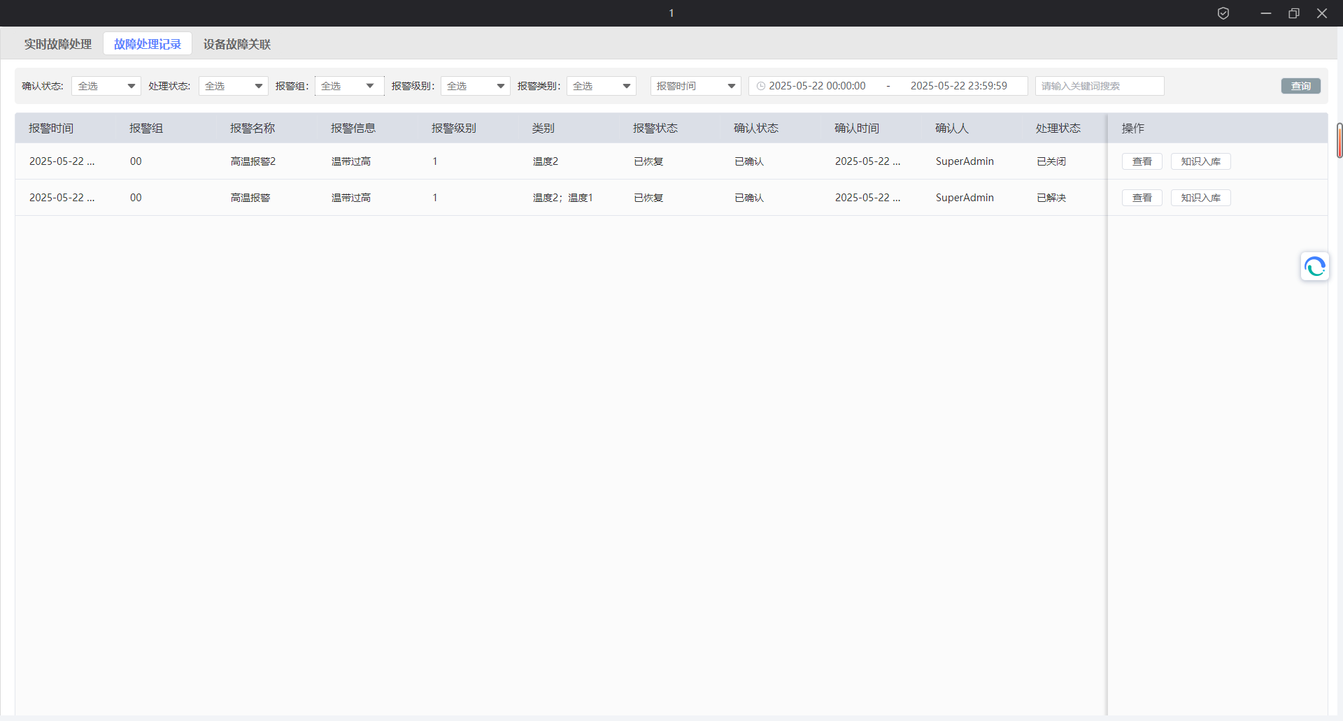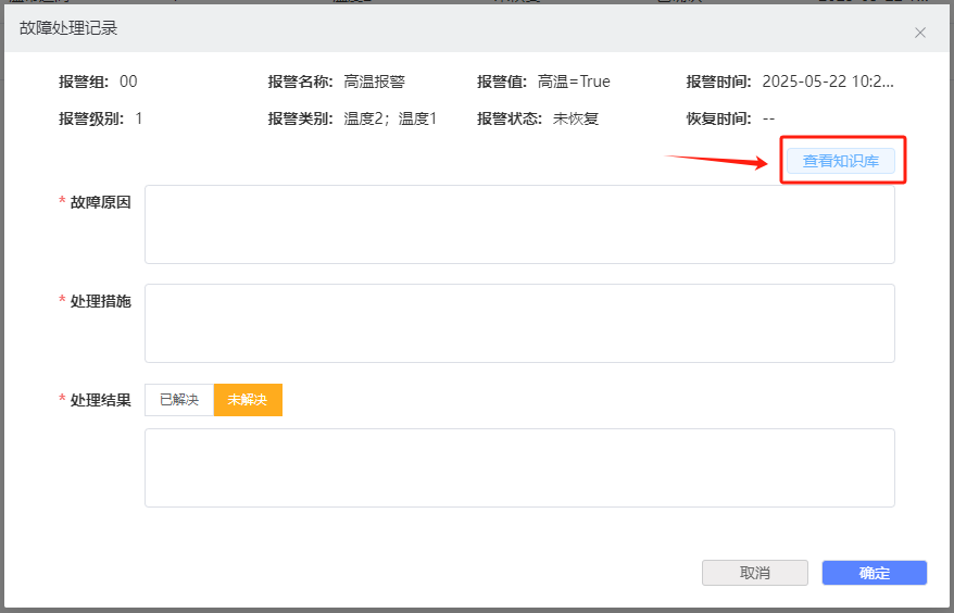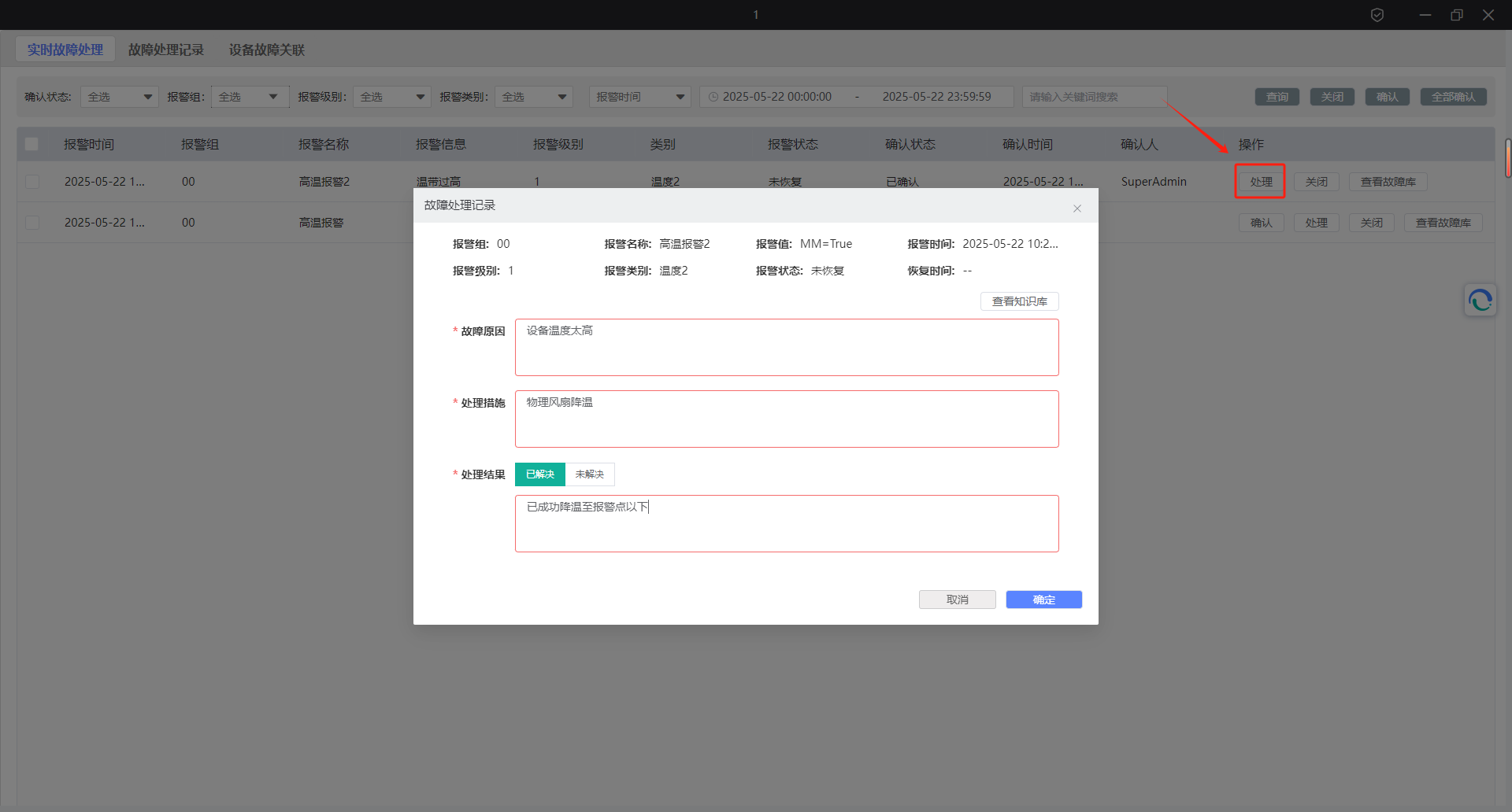 • 故障处理:提供设备故障关联、实时故障处理与故障处理记录界面,用于故障报警关联设备,报警提醒现场人员快速响应并记录处理过程,对有价值的处理对策进行一键故障知识入库积累。
