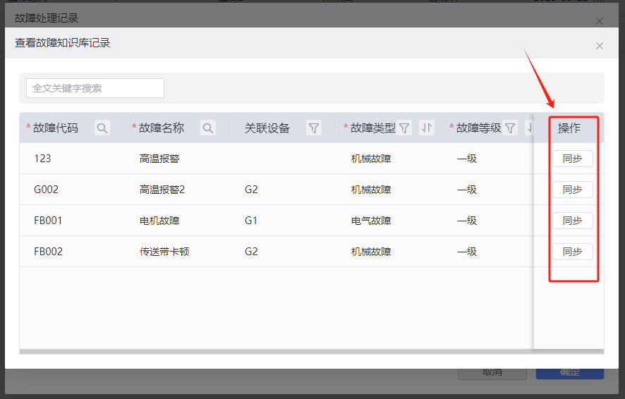 故障知识库被用于设备台账和故障处理功能模块的快速检索查看,并可通过知识入库,将故障处理记录的数据纳入故障库。