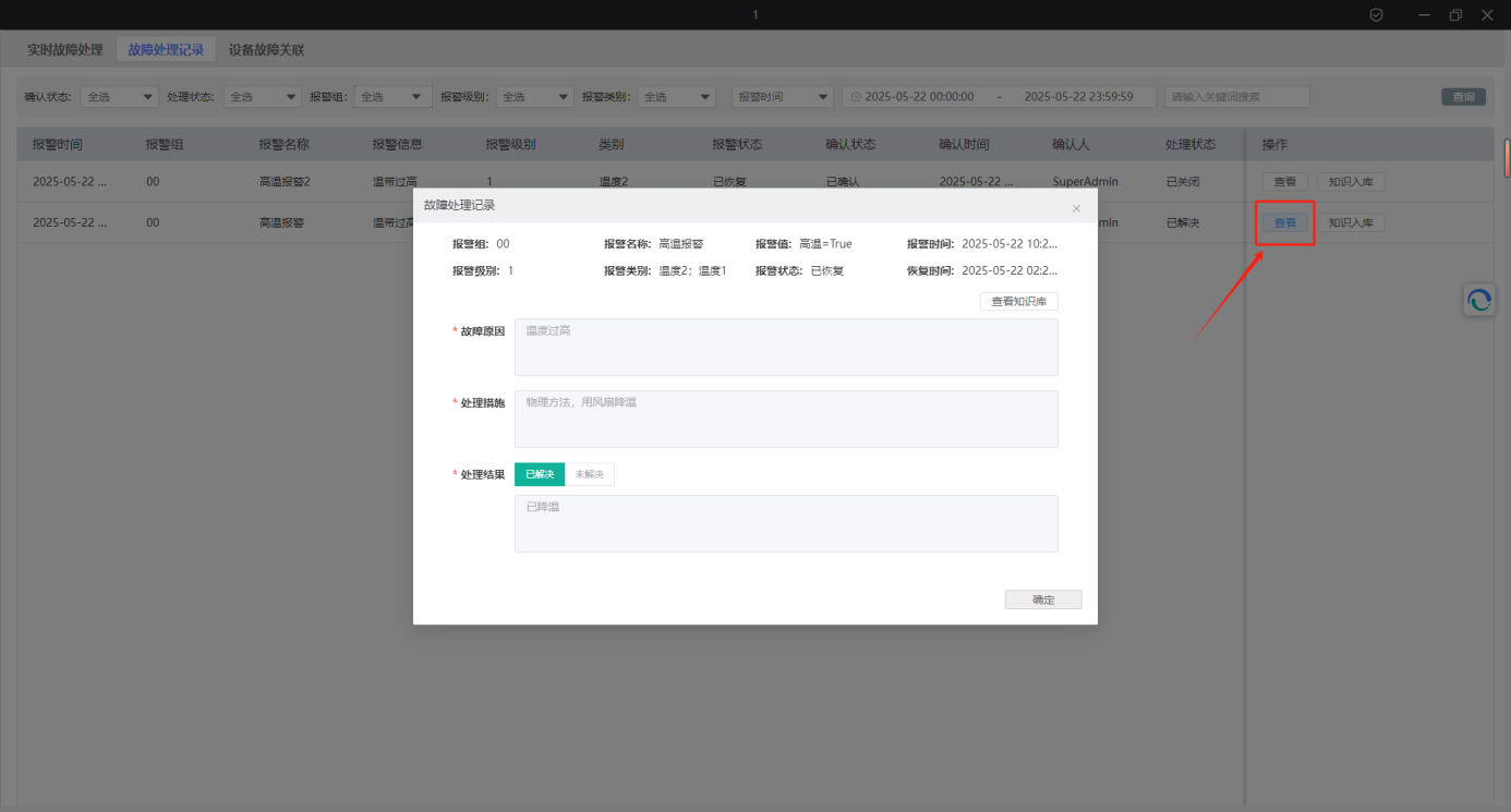 • 故障处理:指该设备已确认的处理故障的数量,点击数字弹窗查看该设备的故障处理记录列表。