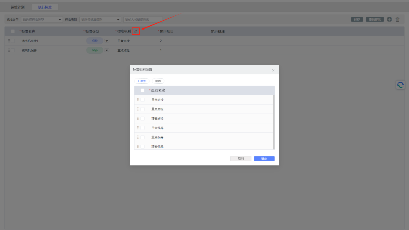当配置执行标准时,需要必须提前设置标准级别,在"标准级别"字段旁点击"编辑"图标按钮,弹窗标准级别设置,可自定义配置标准级别。适用于日常点检和重点点检等级区分时。