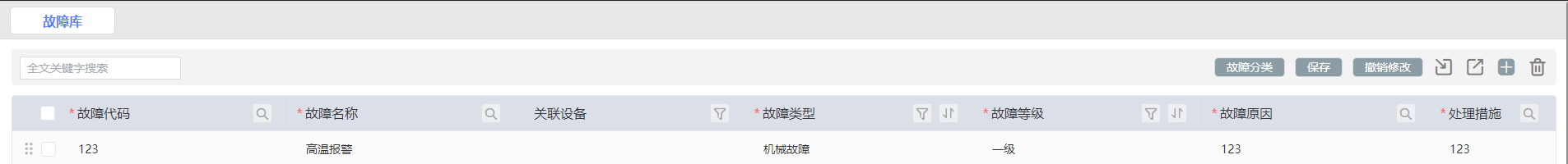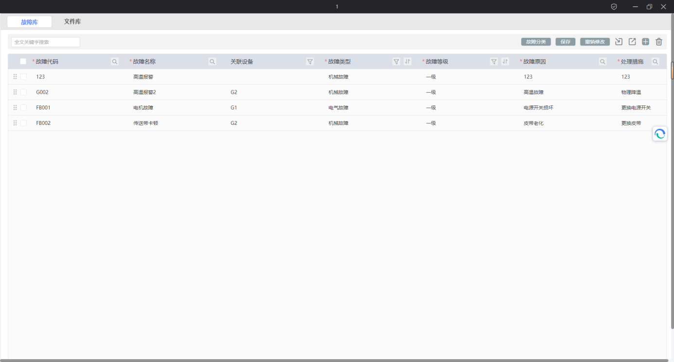 当使用故障库时,必须先定义故障类型和等级,在右上角点击"故障分类"按钮,弹窗故障分类,包含故障类型和故障等级两种分类,支持自定义,确认后,保存到故障类型和故障等级的内容选项中。