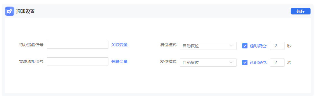 • 延时复位:用于设置在自动复位模式下,系统延迟复位信号的时间间隔,单位为秒,默认不勾选,时间为整型数值类型(且 ≥ 0),确保信号在触发后按需复位以便下一次提醒触发。