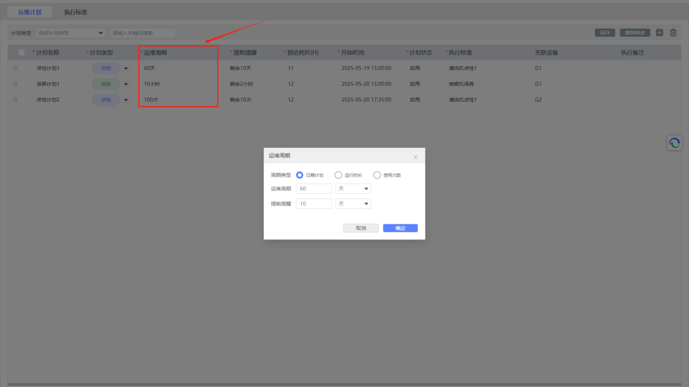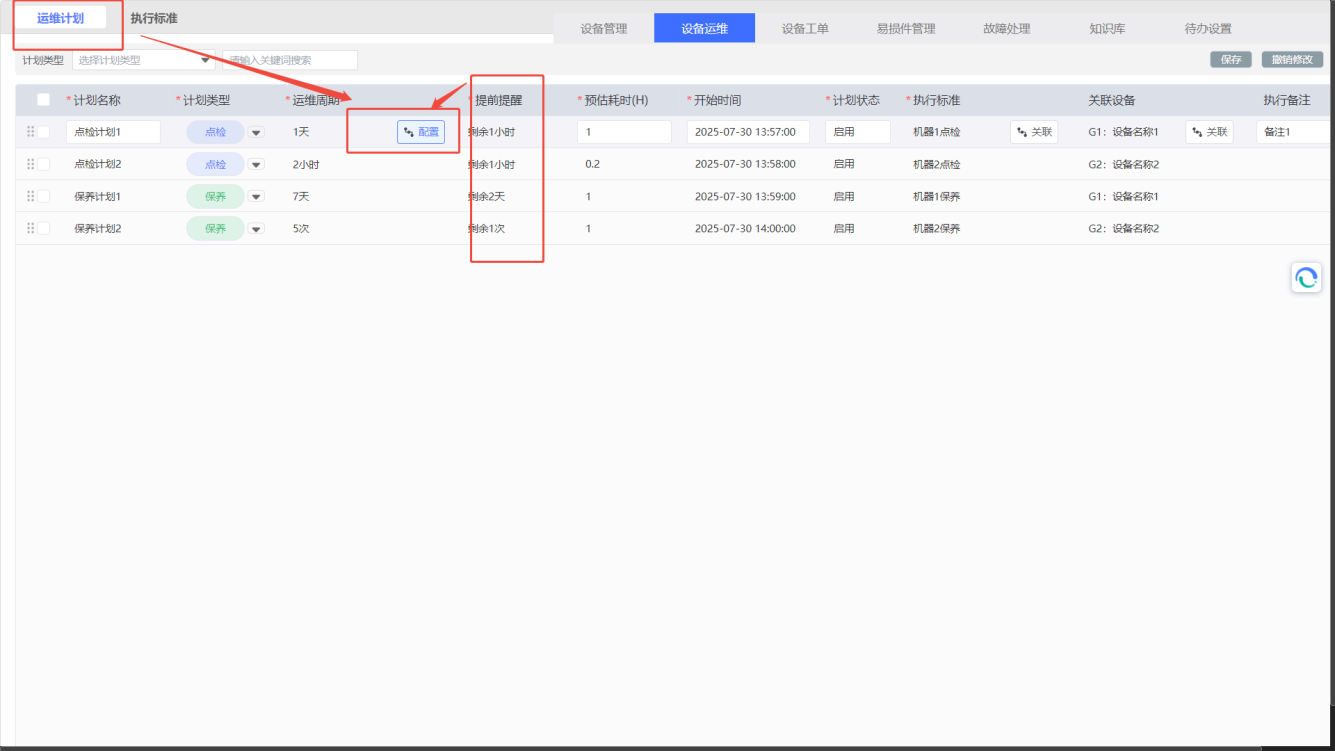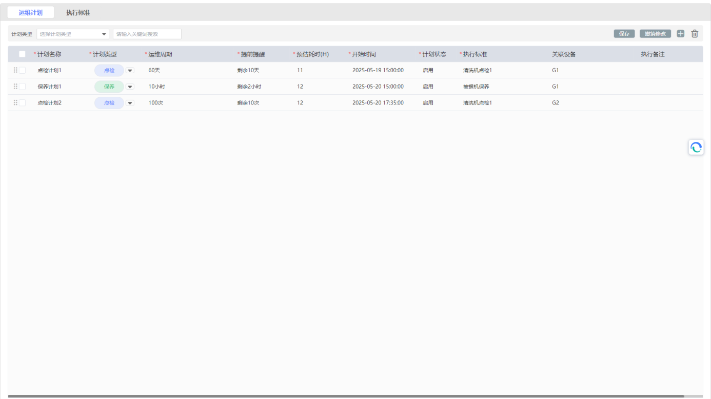 • 设备运维:提供维护计划制定与执行标准界面,用于配置周期性的运维计划和维护作业规范,确保维护工作按执行标准实施。