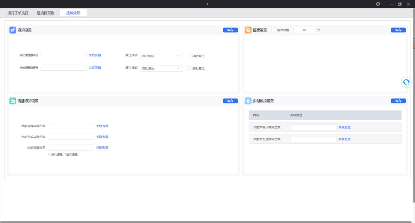 • 当前完成故障名称:当前完成处理的故障名称,关联字符串类型变量,系统会将触发完成处理的故障名称写入该变量,通过组态,现场操作人员能够核对已完成的任务。