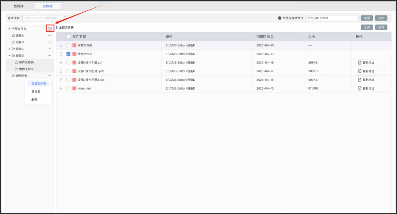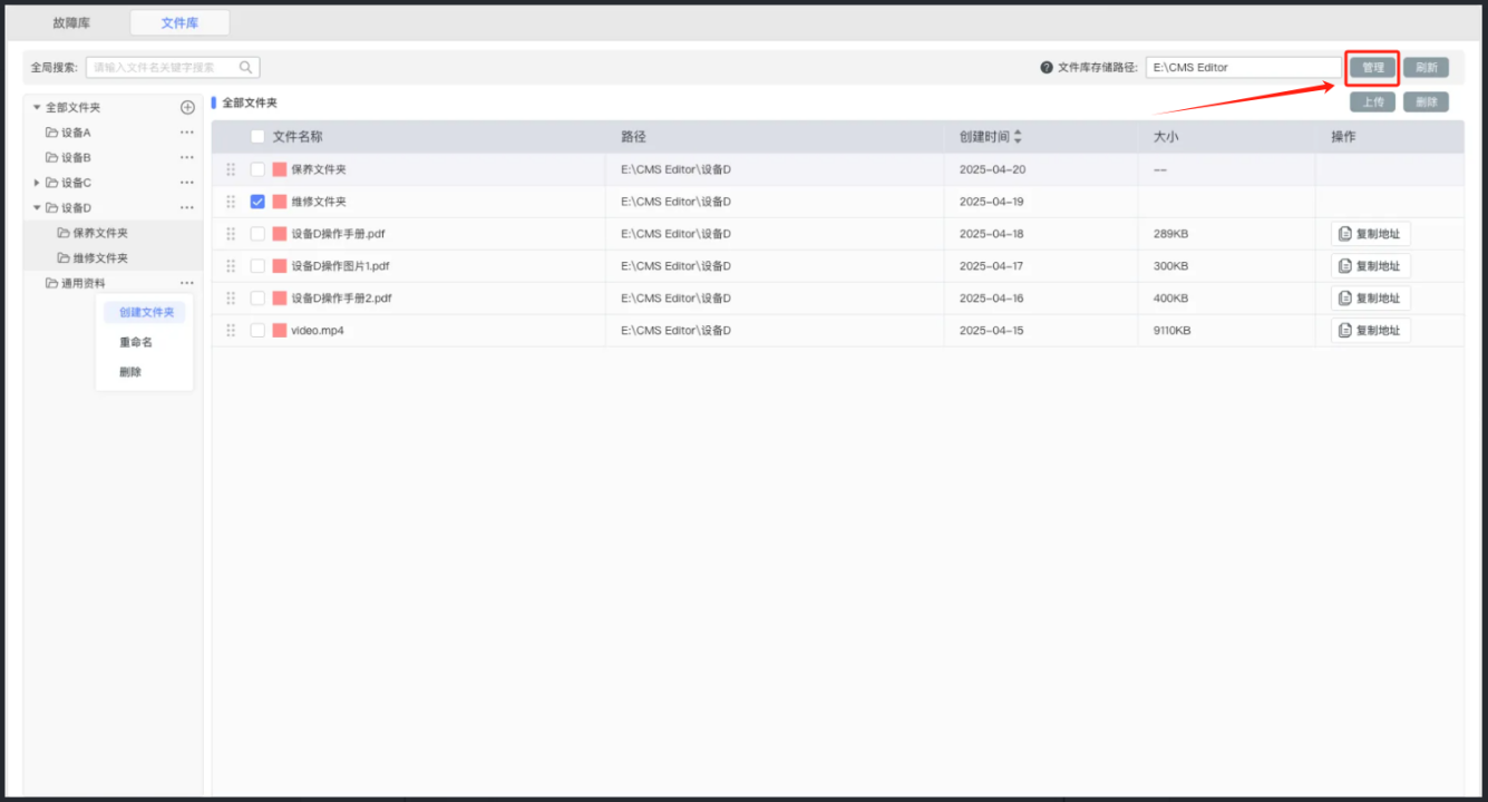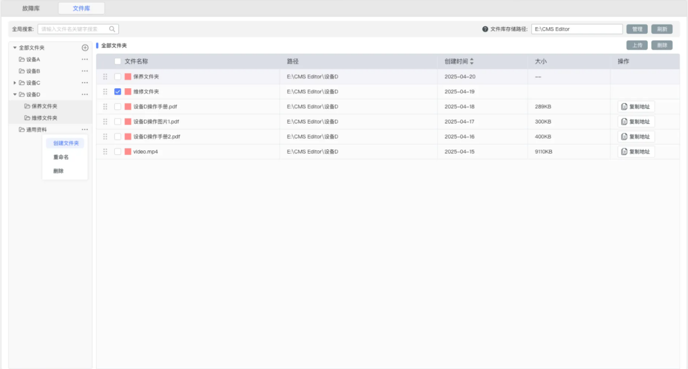文件库是知识库组件中的文件资料库,用于集中管理设备相关的操作说明文件,通过新建文件夹构建整体结构,以及在对应文件夹中上传文件,用于快速查找到所需的资料文件,并点击预览文件信息,同时支持OEM和EU的现场文件的统一上传、管理和搜索查看。