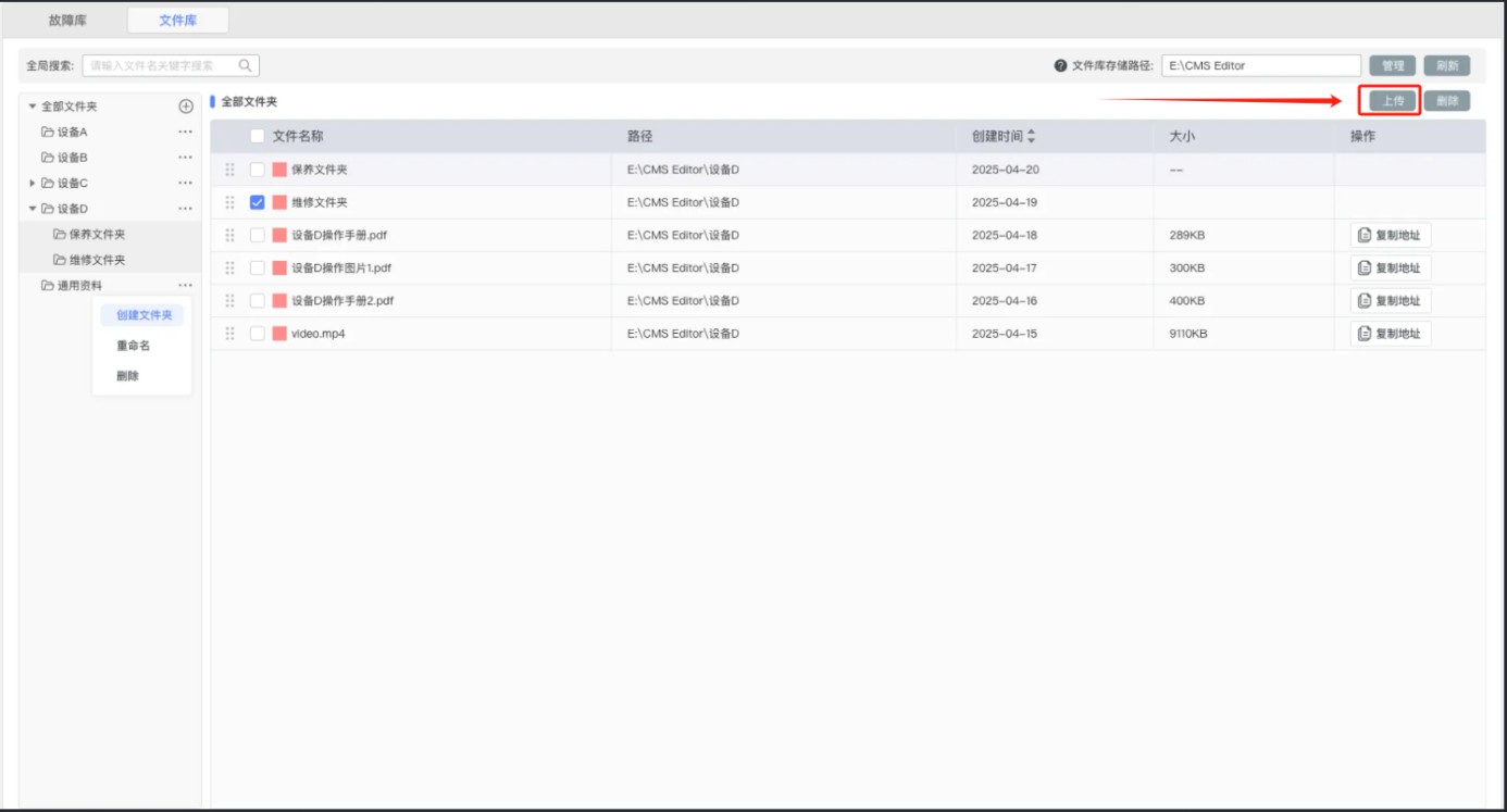 当用户需要上传文件时,选中目标文件夹,如设备D,点击"上传"按钮,允许批量上传,仅支持图片、PDF、视频的文件类型进行上传,上传到选中的文件夹,成功上传后在右侧文件列表展示。