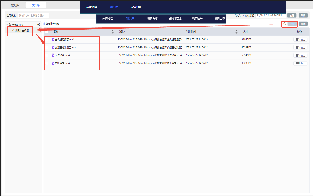 • 知识库:提供故障库与文件库界面,故障库用于集中管理知识入库的故障处理措施;文件库支持OEM和EU的现场文件的统一上传、管理和搜索查看。