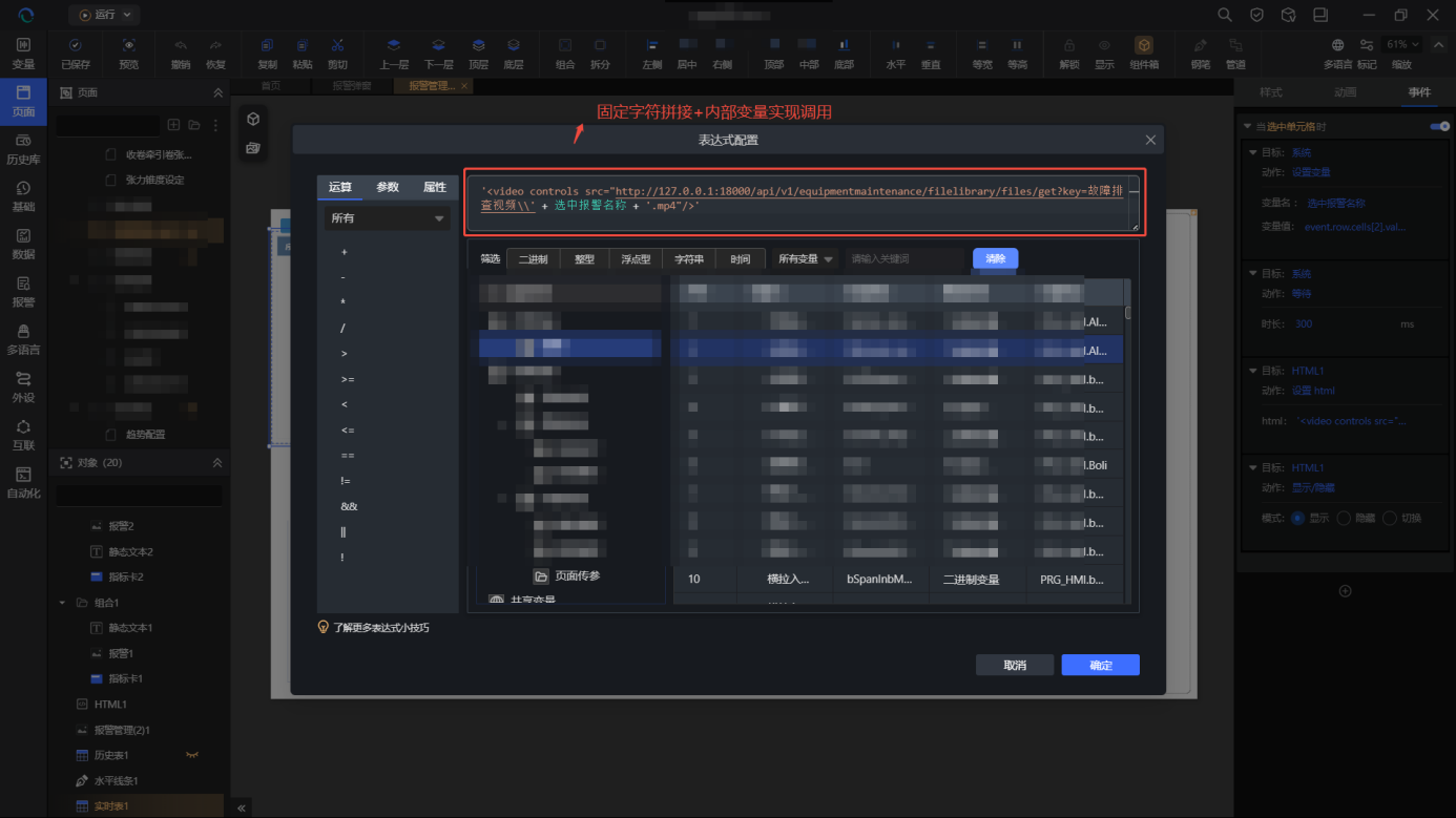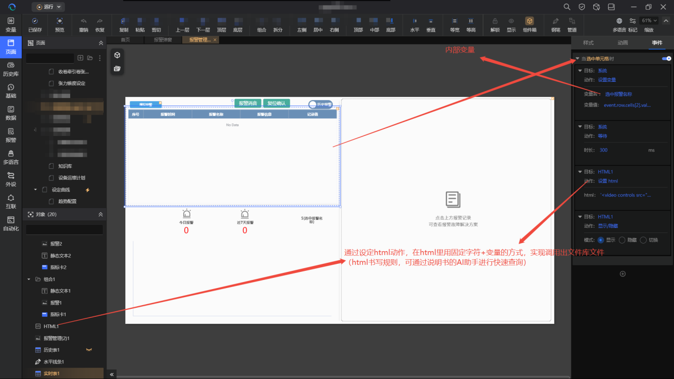 1. 通过表格中的选中事件,把报警事件中的预设文本获取到变量中,如报警时间、报警名称等